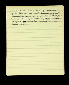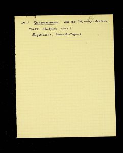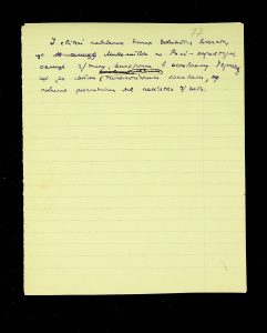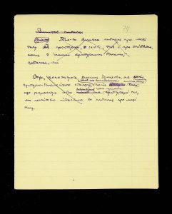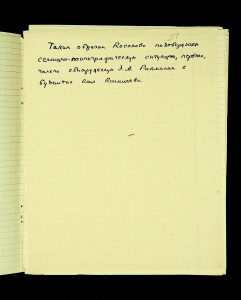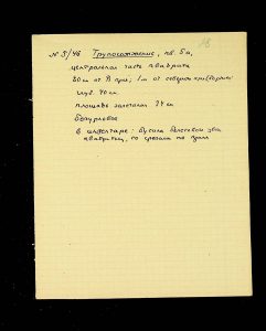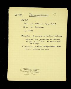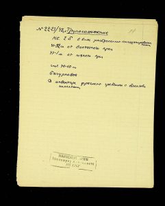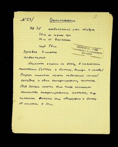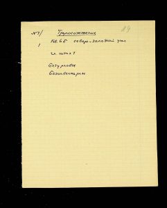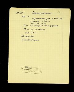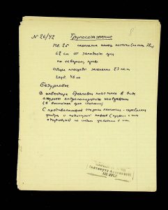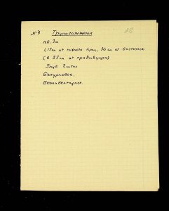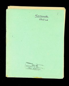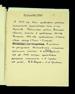 - Description: Labeled as “Kosaniv 1962,” it includes descriptions of the burials investigated that year. The description is likely a field report, intermediate to the final report and publication, as it retains the nomenclature of coordinates from the excavations (square, distance from the walls, and depth). It also provides a description of the burial structure and accompanying inventory.
